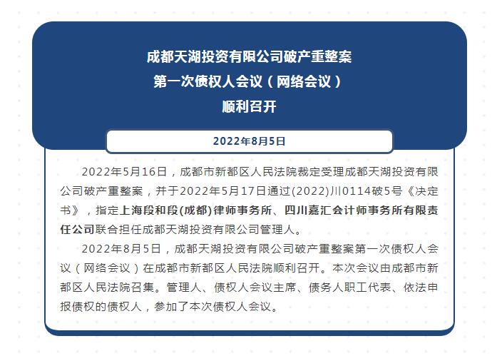 成都天湖投資有限公司破產(chǎn)重整案第一次債權(quán)人會(huì)議(網(wǎng)絡(luò)會(huì)議)順利召開(kāi)