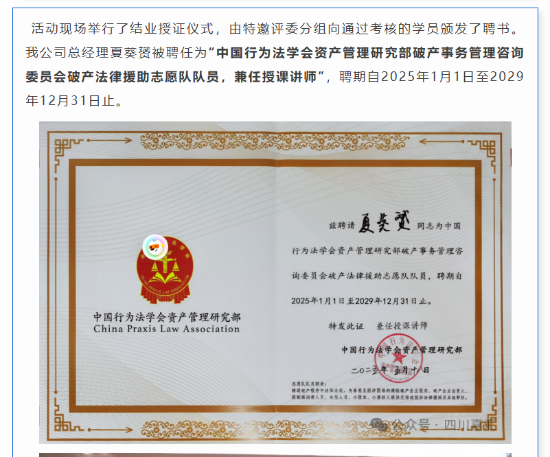 嘉匯會(huì)計(jì)所總經(jīng)理夏葵赟參加“企業(yè)全生命周期·普法講師”公益培訓(xùn),被聘任為“破產(chǎn)法律援助志愿隊(duì)隊(duì)員”